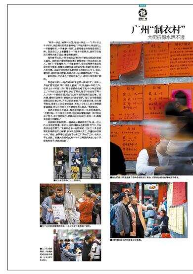 每年春节过后,广州市海珠区“制衣村”都会出现这样的招工盛况。拥挤的大塘街两侧站满了像焉老板一样出来招工的人。他们一手拿着样衣,一手拿着牌子,有的还将牌子放在电动车的车篮里,骑着车绕着街道边走边吆喝,希望引起更多工人的注意。在路中间行走的是前来找工的制衣工人们。驻足,看样衣,询问价格与数量,如果合适,马上跟着老板进厂干活。