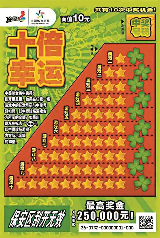 “十倍幸运”是2009年12月首次推出的即开票,寓意幸运翻倍、诸事十全十美。由于游戏简单直接、趣味性强,主题寓意美好,长期受到购彩者的追捧。