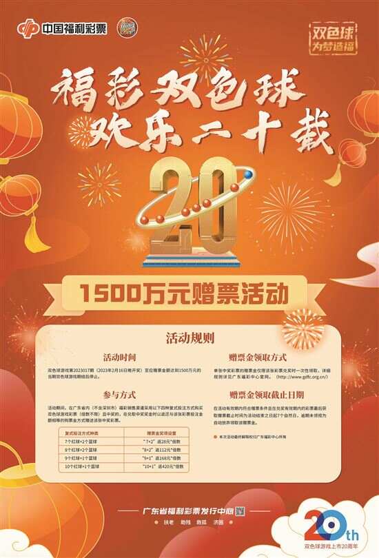 提醒各位广东彩民,为庆祝双色球游戏上市20周年,广东福彩从双色球游戏第23017期(2023年2月16日晚开奖)起,开展“福彩双色球 欢乐二十载”1500万元赠票活动。活动期间,在广东省内(不含深圳市)福彩销售渠道采用“7+2”(28元)、“8+2”(112元)、“9+1”(168元)和“10+1”(420元)4种复式投注方式购买双色球游戏彩票(倍数不限)且中奖的,在兑取中奖奖金时以返还与该张彩票投注金额相等的购票金方式赠送该张彩票。