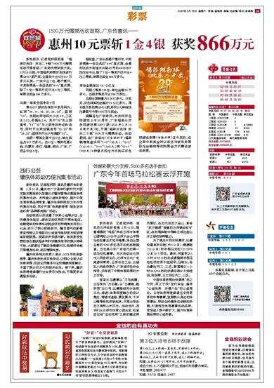 新快报讯 记者陆妍思报道 “福彩双色球 欢乐二十载”1500万元赠票活动开展首期,广东彩民便斩获大奖。2月16日晚,中国福利彩票双色球进行第23017期开奖,全国共中出6注817万多元头奖。广东中出1注,落户惠州,中奖彩票是一张自选的“6+5”复式票,除了1注一等奖外还中出4注二等奖,单票总奖金866万多元。