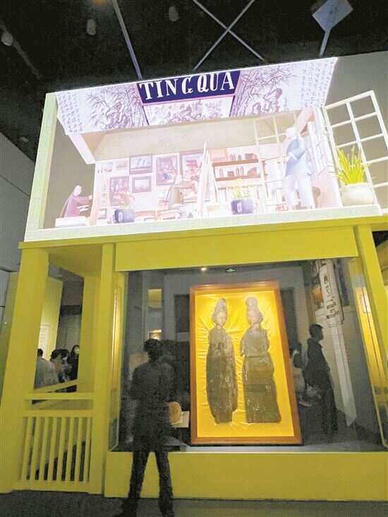 展厅一进门,两位“木美人”的高俊端庄,已吸引众多游客。身着现代服饰的拍照女子,和这件明代晚期的国家一级文物,袅娜呼应,再配以文物上方用裸眼3D效果营造的200年前外销画家“廷呱”画室,一时间,画家、作品、游人,在重叠的时光中无缝衔接。