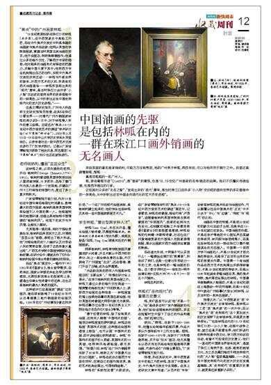油画在中国的传播,不是到20世纪初的新文化运动才出现,而是早在18-19世纪就已经发生。中国油画的先驱,不是在京沪等地的中心画坛声名显赫的李叔同、林风眠与徐悲鸿等人,而是包括林呱在内的一群在珠江口靠外销画谋生的无名画人。中国第一个到西方学习油画的人,不是19世纪末才到北美的李铁夫,而是早了近百年出洋的林呱的前辈关作霖。中国第一个有油画作品在西方艺术机构展出并获得称誉的,不是20世纪前期的李铁夫,而是从1835年起就有多幅油画在英、美的美术学院、美术展览会展出的林呱。中国最早接触裸体人物画的,不是20世纪初期在上海轰动一时的刘海粟,而是19世纪中叶就在广州临摹《大宫女》的林呱,以及当时的一批佚名画家。”