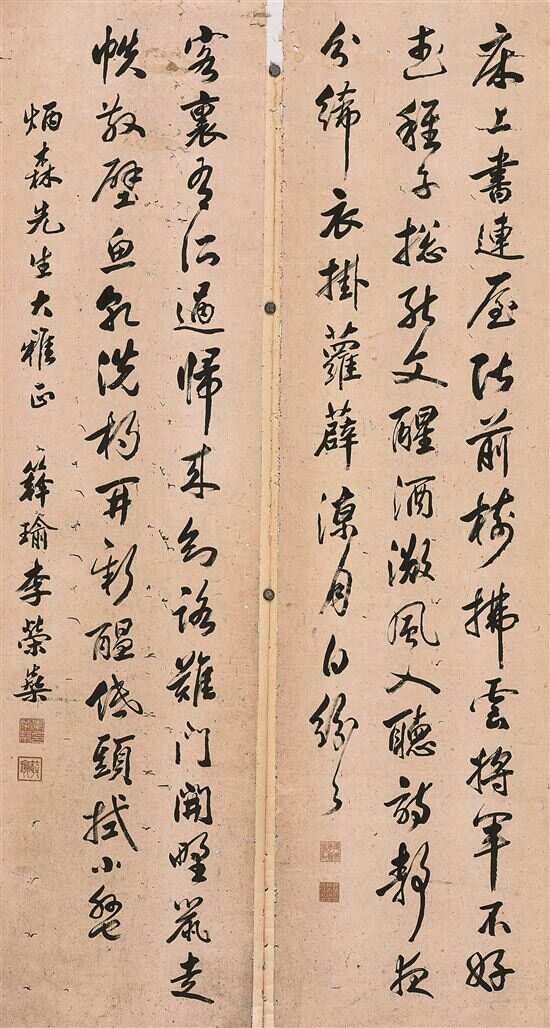 李荣燊生活在光绪年间至上世纪四十年代间,虽然时间并不太久远,但其传世的墨迹并不多见。近见无聊斋藏其行草书二屏。纸本,原装旧裱,每屏纵134厘米、横40厘米。右:“床上书连屋,阶前树拂云。将军不好武,稚子总能文。醒酒微风入,听诗静夜分。絺衣挂萝薜,凉月白纷纷。”下钤:“铁城李竿瑜印”朱文、“梅阁留春,荷亭销夏,自娱而已”白文。内文抄录杜甫《陪郑广文游何将军山林十首》之九。左:“客里有所过,归来知路难。门开野鼠走,帙散壁鱼干。洗杓开新酝,低头拭小盘。炳森先生大雅正,竿瑜李荣燊” 下钤:“李荣燊印” 白文、“竿瑜”朱文。抄录杜甫五言诗一首。从传统的形制和内容来看,应为四屏或六屏,内容均抄录杜甫诗。