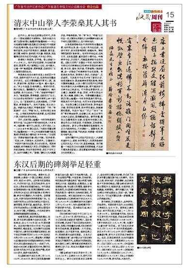 另外,还有《香山翰墨》一书收录李荣燊行草书中堂:“处尘埃中不惯与流俗往来,(厌其喧闹,)每欲缚一椽于万山绝顶,人所不到处,(从一二友生读书啸)歌以自乐。”内容抄录屠长卿句。《翰墨流韵——中山市档案馆馆藏书画选集》收录李荣燊小楷作品(张仲伟捐):“文征明曰:‘苏舜钦端劲沉着,得力于颜。’而评者谓:‘花发上林,月滉淮水,岂其然乎。’王鲁斋曰:‘米老评子美书如五陵,年少亦太贬矣。观其神韵意度,终非南渡后人所及,《平园集》曰:‘同时则妬贤嫉能,异世则哀穷悼屈,若见于百年之后,当亦什袭藏之乎。’”款题:“灏如九兄大雅属并政,竿瑜李荣燊。”钤:“李”朱文、“竿瑜”白文印各一枚。《题写长洲黄氏大宗祠魏碑长联》,刻于祠内正殿顶梁柱上,迄今保存完好。