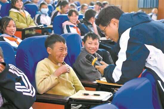 ■药山镇中心小学的同学们与阅读专家王钢积极互动。