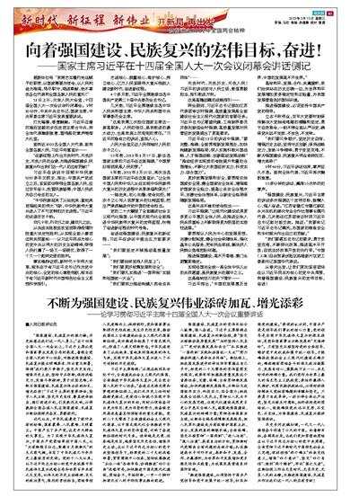 “强国建设、民族复兴的接力棒,历史地落在我们这一代人身上。”在十四届全国人大一次会议上,习近平主席从党和国家事业发展全局的高度,着眼全党全国人民的中心任务,对推进强国建设、民族复兴提出明确要求、作出重大部署,强调“我们要只争朝夕,坚定历史自信,增强历史主动,坚持守正创新,保持战略定力,发扬斗争精神,勇于攻坚克难,不断为强国建设、民族复兴伟业添砖加瓦、增光添彩!”习近平主席的重要讲话,坚守人民立场、坚定历史自信、彰显使命担当、指引前进方向,引发热烈反响,必将激励全国各族人民在强国建设、民族复兴新征程踔厉奋发、勇毅前行。