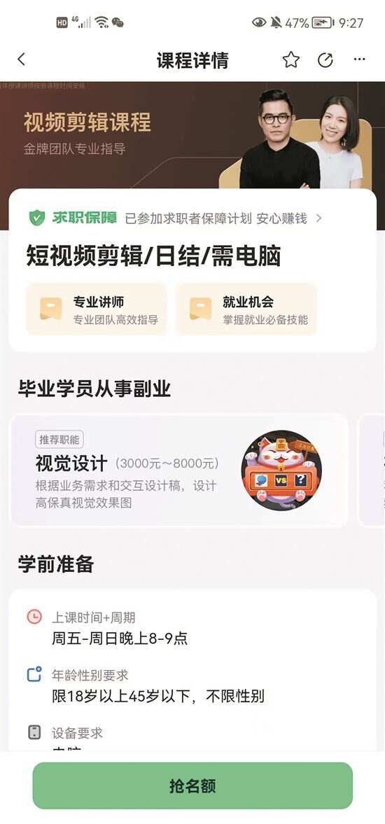 记者发现,不少受访者的“培训课程”都是从一个名为“青团社兼职”的App上找的。新快报记者也下载了“青团社兼职”App,打开首页就有“语音聊天主播”“兼职骑手”“美容师”等兼职岗位。记者随机点进一条标记为“300元/天”的视频剪辑“职位”后,链接跳转为“视频剪辑课程”页面,“适合人群”有大学生、“宝妈”和待业人员等,提示信息有“本机构对接各大商家,每天单量充足过剩”“一个视频300-500元起,2000-6000元的订单也常有”等。记者报名该课程后,很快有“老师”来添加微信。“咱们培训是对接资源一体化的,前期你可以先学习,然后开始做单,后期拿你做单的佣金每个月抵扣学费就好。”在免费直播课程上,老师讲授的剪辑技术很基础,但课堂中不断插入“学习我们的课程,兼职收入很高”等暗示性话语。