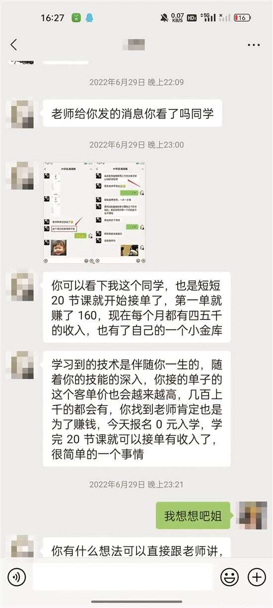 “一开始是想去青团社App找兼职,顺便学点剪辑技能,就报名了软件上推荐的课程。”今年读大三的小北(化名)是一名美术生,她对新快报记者爆料说,“课程老师在软件上跟我聊了几句,就让我加微信。上了几天免费课程后,老师就让我去‘领取课程福利’。说是不只能学剪辑,还能给我们派单,更有‘助学金’名额。”