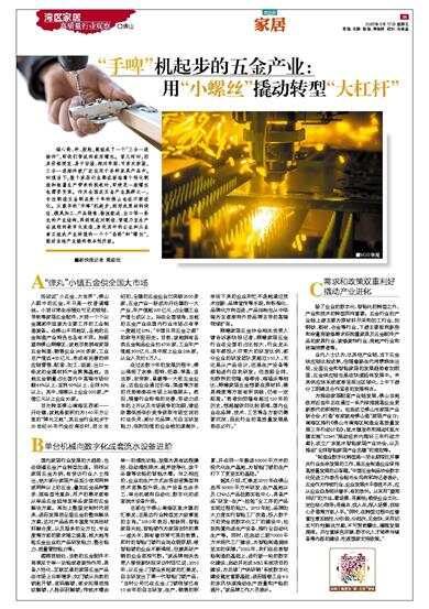 俗话说“小五金,大世界”,佛山人眼中的五金,不只是一枚普通螺丝。小到日常生活随处可见的铰链、导轨等家居五金配件,大到一个个以金属部件组装为主要工序的工业制造装备。在佛山不同地区,各地的五金制造产业特色也各有不同。抬眼望向佛山顺德区,该地目前拥有家居五金制造、销售企业2400多家,工业总产值近400亿元,形成有完善的供应链管理、配套、加工、组装、出口一条龙的金属材料产业聚集基地。当地五金销量占比国内中高端市场份额65%以上、亚洲50%以上、全球30%以上。其中,规模以上企业200家,产值亿元以上企业30家。