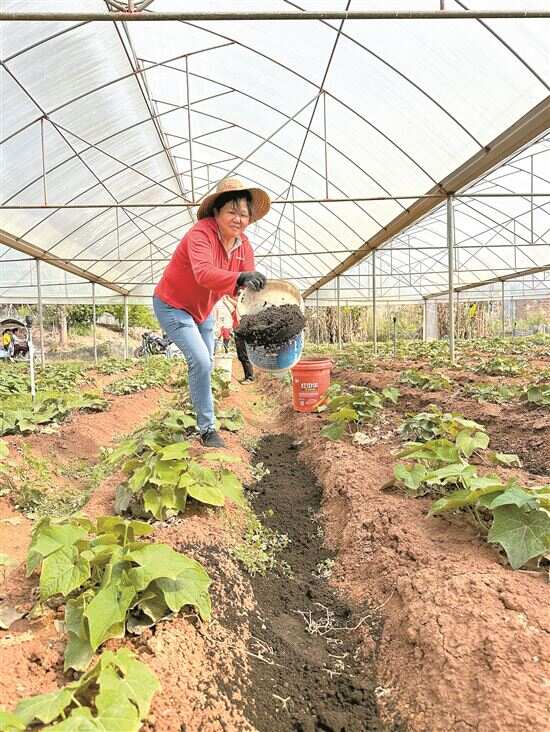 ■梅州市五华县潭下镇百安村的精品蔬菜基地长期带动附近农民务工。图为一名工人在施肥。