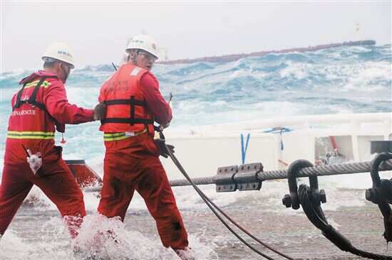 ■“南海救115”抵达受困货船附近,水手长卢大明(右)带领水手们施救(3月4日摄)。新华社发