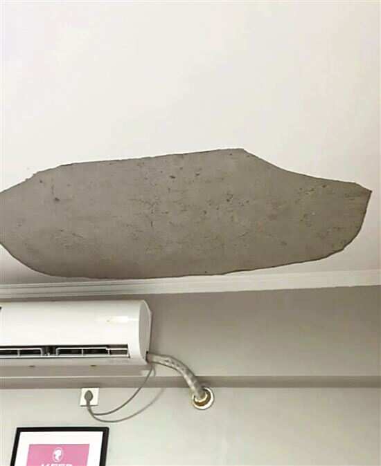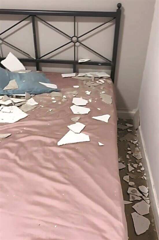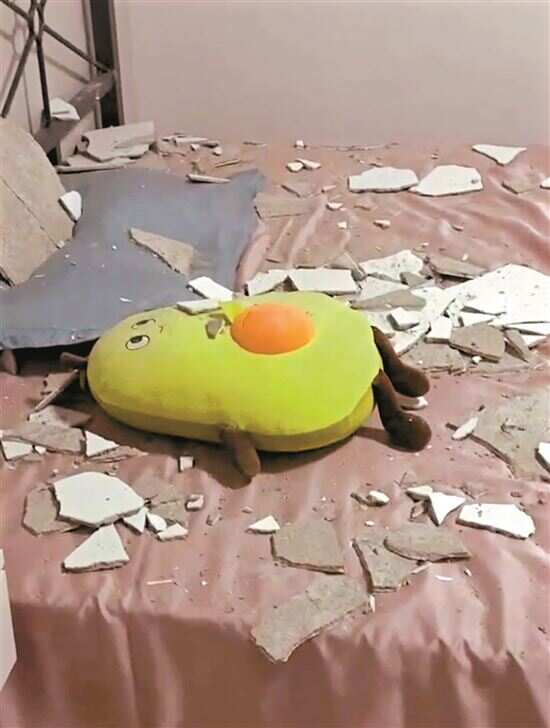 一开灯,眼前的场景令小方冒了一身冷汗:一块直径约一米的天花板掉下来,正好砸中了她刚刚躺着的区域,床上、地板上全是天花板掉落的碎片。“我觉得要是有人在那里睡着了,下一秒人就没了,因为那块天花板掉下来的位置正对着头和上半身。”小方后来回忆,脱落的天花板至少有两厘米厚。