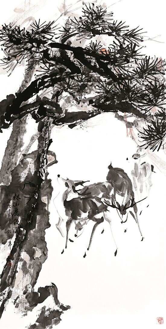 周国城:是的,比如钟瑞军画鹿,如果他没有前面扎实的兰竹和书法训练,一定画不到现在的水平。我有留意到某些画家画鹿,他们的造型能力也许很扎实,但毕竟不是画标本,由于缺乏过硬笔墨的训练,画面就容易缺乏写意的精神、缺乏线条的质量、缺乏笔墨韵味,生动性和艺术感染力就略显不足。