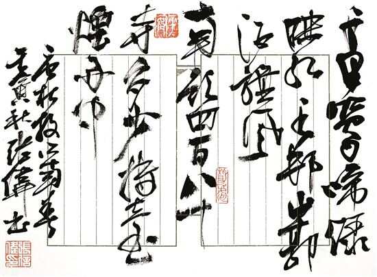 谈到这次展览,周国城表示:“张伟此次展览准备了一年多时间,也算得上是‘废纸三千’。南方画院美术馆其中有一面展墙比较适合展出六尺条幅作品。起初我建议他先着手创作六尺条幅书法。此后,他每隔一段时间,就把写好的卷成一捆,抱来给我看,但每次基本上都被我否掉。后来,考虑到展览时间越来越近,就先预挑了四张作品。让他同步开始写其他作品创作。没想到,他那天回去后,马上就又写了四张六尺书法作品。而这最后四张恰恰就是本次展览的作品,那一刻他开始懂得了如何写字,悟到了窍门。后面他继续创作斗方、条幅、扇面等给我看,基本都可以通过,可能就是因为他找到了自己的方法。”