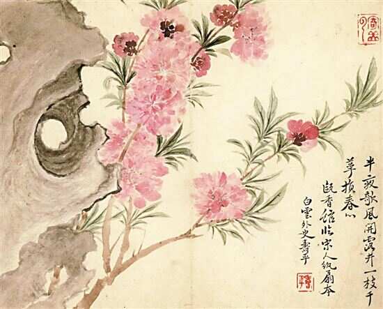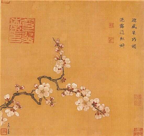南宋马远有《倚云仙杏图》。杏花是典型的迎春之花,范成大说“浩荡光风无畔岸,如何锁得杏园春”,与“马一角”的边角取景,当时呼应。这幅画用笔绝妙,用顿挫苍劲的枝条,战胜了绢面上略显娇柔的羸弱花瓣。