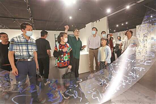 这次在九里艺术空间大厅展出了2米高的六件大型书法装置,而小厅展出了多件80厘米高的书法装置,打破以往的卷轴书法模式,书法的雕塑感与时空感得到形塑,产生了新的空间视觉。现场另一个吸睛点是傅彦斌书写的15米书法长卷,选择了透明的玻璃纸来书写,所用的墨不再是黑墨,而是纯银色及克莱因蓝色。这些飞龙走凤、群鸟出林的草书,悬挂起来,在光影的作用下,字影投到白墙上,仿佛镜面装置。