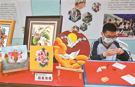 “这是掐丝珐琅,是非遗项目。”启智学校展位上,一名男生一边沿着纹路粘贴铜丝,一边向来往的师生介绍。他的娴熟和热情透露着他对这项工艺的喜爱,一开始,记者并没有发现这是特殊学校的展位。记者了解到,广州市越秀区启智学校以家庭服务为核心的职业高中课程是特殊学生顺利回归社会、独立生活的重要支持保障,包含“家政服务、手工制作、园艺与庶务、食品制作”等多个职业项目。衍纸艺术和非遗项目掐丝珐琅是其中的特色项目,教师根据学生能力设计相应的辅具支持,提高手部稳定性和精细动作能力,获得成功体验。