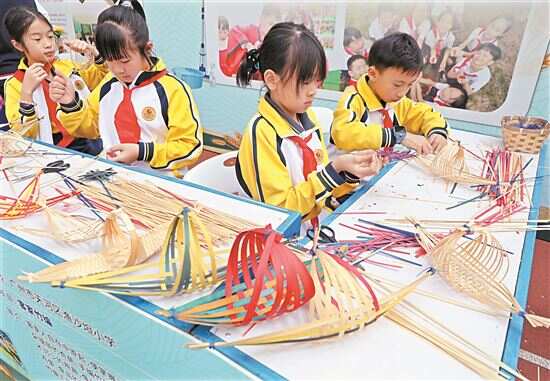 位于凤凰山脚下的广州市天河区渔沙坦小学是天河区最北部的一间靠近城郊地区的学校,负责劳动教育的龙老师发现,学生大多“耐不住性子”,很多教学设计效果并不好。在经过实践后发现,学生们对具有乡土文化特色的“客家竹编”情有独钟,“再顽皮的孩子也能十分专注地坐下来安静编织”,从而也找到了学校劳育发展的路径。“我自己编织了一个竹船,能放水果,过年的时候亲戚来我家,爸妈就说这个竹船是我编的!”一名正在编织的小女孩自豪地说。