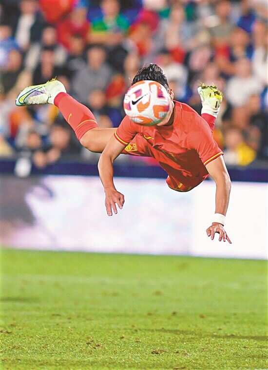 ■3月23日,中国队球员林良铭在比赛中鱼跃头球攻门。新华社发
