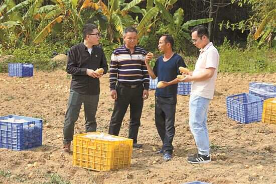■江门恩平市良西镇工作队队长劳泰霖(左一)与村两委干部一同下田,了解今年马铃薯的收获情况。