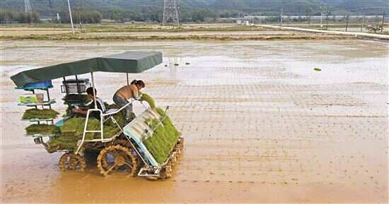 ■江门恩平市良西镇福稻公司的水稻基地,机械化插秧正在进行。
