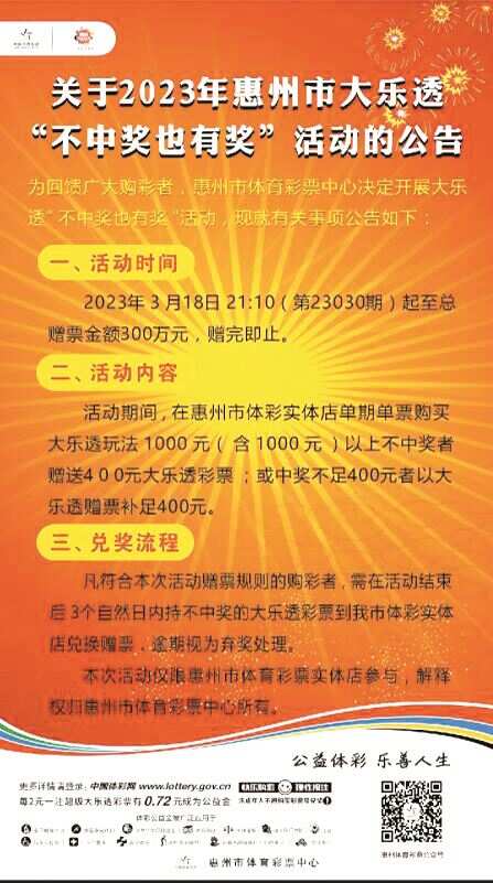 据了解,本次活动期间,在惠州市体彩实体店单期单票购买大乐透1000元(含1000元)以上不中奖者,赠送400元大乐透彩票;或中奖不足400元者,以大乐透赠票补足到400元。凡符合本次活动赠票规则的购彩者,需在活动结束后3个自然日内,持不中奖的大乐透彩票到惠州市体彩实体店兑换赠票,逾期视为弃奖处理。
