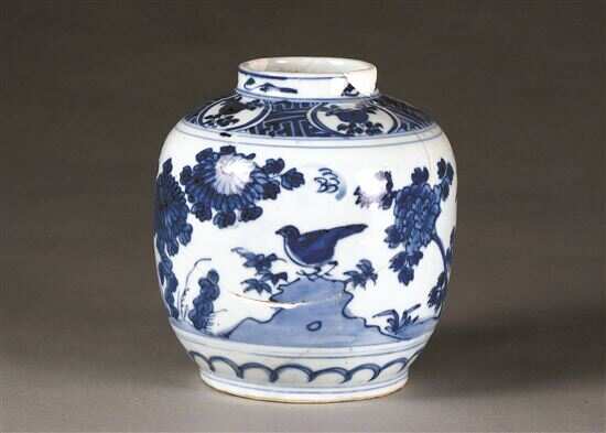 ▶河南开封州桥及附近汴河遗址出土的明晚期景德镇窑青花花卉纹罐。