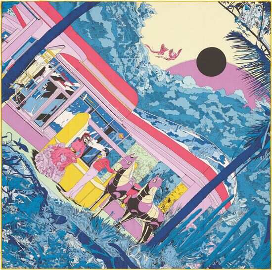 丝巾以美式漫画风格描绘了现实与幻想的交界:日食时分的暮色之下,一位英勇骑士拯救了赴舞会途中迷失方向的少女。