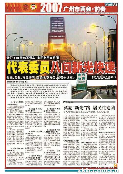 新路修好3个多月迟迟不开通,2007年1月18日新快报强力推出《代表委员八问新光快速》,引起广州市领导重视,促使新光快速路一期主线工程开始免费试运行;为让广大中低收入家庭真正实现住有所居,新快报记者历时一个月对广州的保障房进行调查,在2011年3月推出了5个版全景式的“起底”报道;针对市场上有购买“献血证”渠道一事,2012年底到2013年初,新快报连续发出了《五问“献血证”买卖漏洞》《三问无偿献血账目》,以持续报道推动了献血秩序的规范化……