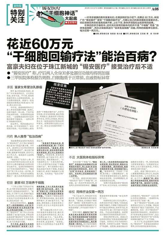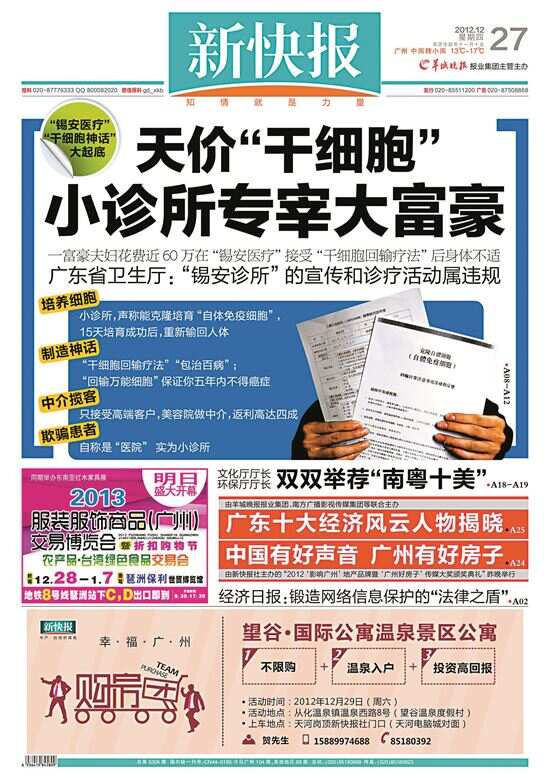 2012年底,“新快315”独家重磅推出《“锡安医疗‘干细胞神话’”大起底》系列专题报道,一举揭发注册性质为诊所的“锡安医疗”打着“全科医院”旗号,涉嫌虚假宣传、超范围开展“体细胞”回输项目。