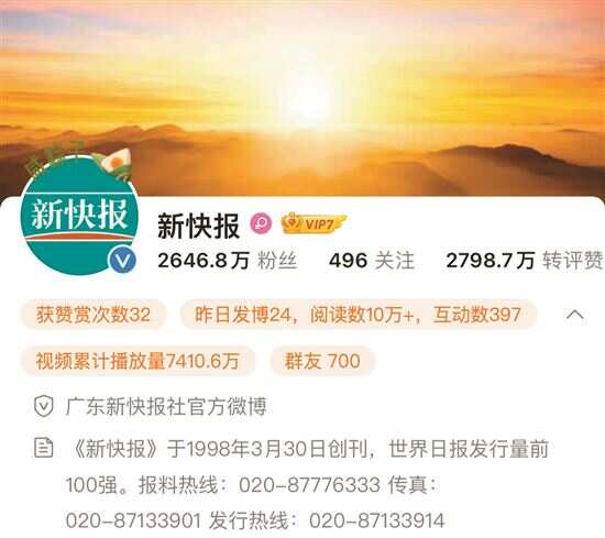 2023年3月30日,新快报官方微博粉丝达2646万,是华南地区最具影响力的媒体之一。