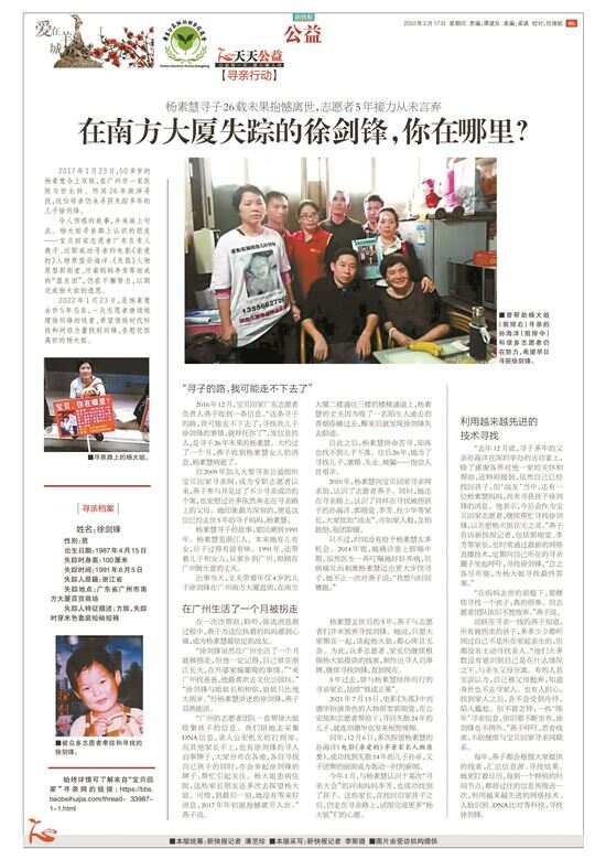 杨妈妈和徐剑锋的故事是“寻亲行动”的一个缩影。自2006年9月中秋节前首次启动以来,新快报携手广州市民政局,为流浪儿童寻亲,帮助不幸离散孩子的家庭团圆。万千读者的关注与加入,无数个体的助力与接力,16年来,我们为近百名流浪儿童找到父母,回归家庭。