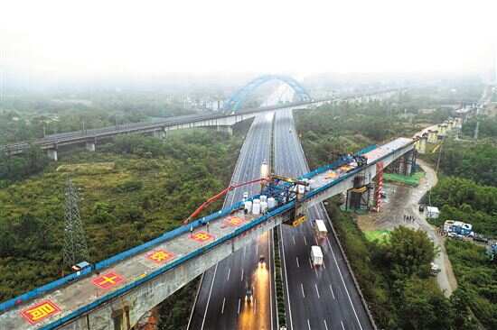 3月29日晚,广湛铁路长兴村特大桥跨G15沈海高速连续梁顺利合龙,这也是全线首座跨高速连续梁合龙。广湛铁路正线全长401公里,通车后将实现广州中心城区至湛江中心城区90分钟互达。新华社发