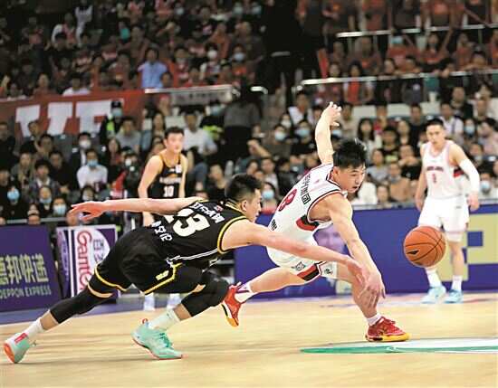 ■郭艾伦(左)与崔永熙拼抢,后者拿到全队最高的25分。新快报记者 李小萌/摄