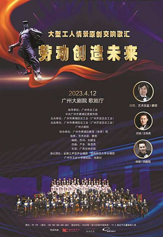 新快报讯 记者徐绍娜报道 大型工人情景原创交响歌汇《劳动创造未来》将于4月12日在广州大剧院唱响。作品由广州市总工会、中共广州市黄埔区委宣传部指导,广州市黄埔区、广州开发区总工会与广州大剧院联合主办,由男高音歌唱家王传亮和男中音歌唱家洪振翔领唱。