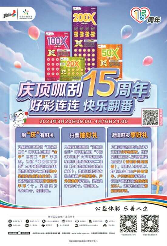 刮“庆”有好礼:凡购买体彩任意面值“超级加倍Ⅱ”即开票,在票面“全中”区内刮出“庆”字标志,通过体彩APP或微信小程序扫描票面保安区二维码,领取智能运动手环1个。