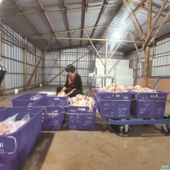 ■工人在新田生态鸡养殖基地的宰杀区工作。