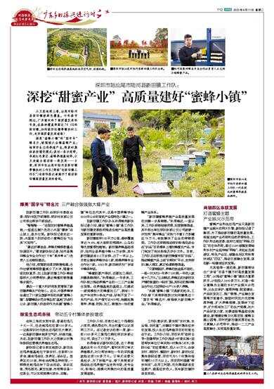 尤其值得一提的是,新田镇将结合广东省“百县千镇万村高质量发展工程”,以推动“蜜蜂小镇”建设为重要抓手,计划投入2800多万元,打造一条以蜜蜂为主题的乡村产业振兴示范带,从生态保护、蜜源种植、配套建设、产品研发加工、推广销售、产业融合发展等方面着手,鼓励村民加大优质蜂源种植、扩大养蜂规模,发展林下经济,扩大现有加工厂的生产规模,加大产品研发力度,完善道路等基础设施建设,新增建设蜂文化展览馆、蜜蜂主题公园等,同时把新田镇浓厚的红色元素融入示范带中,推动一二三产业高度融合,实现高质量发展。