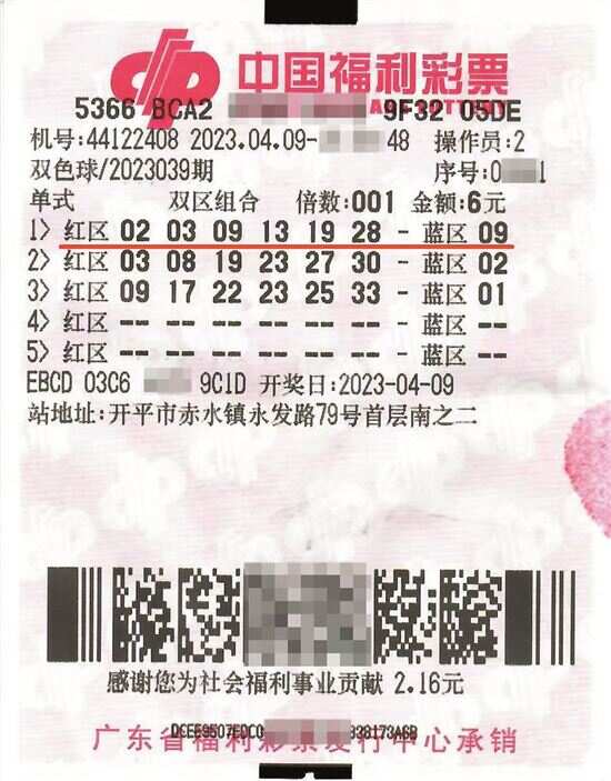 新快报讯 记者陆妍思 通讯员梁一鸣报道 4月9日第23039期双色球开奖中,江门开平赤水镇永发路79号首层南之二的44122408投注站喜中1注890万多元头奖,中奖彩票是一张机选的6元3注单式票。开奖次日,中奖者仲先生(化姓)独自一人火速来到江门市福利彩票发行中心办理兑奖手续。