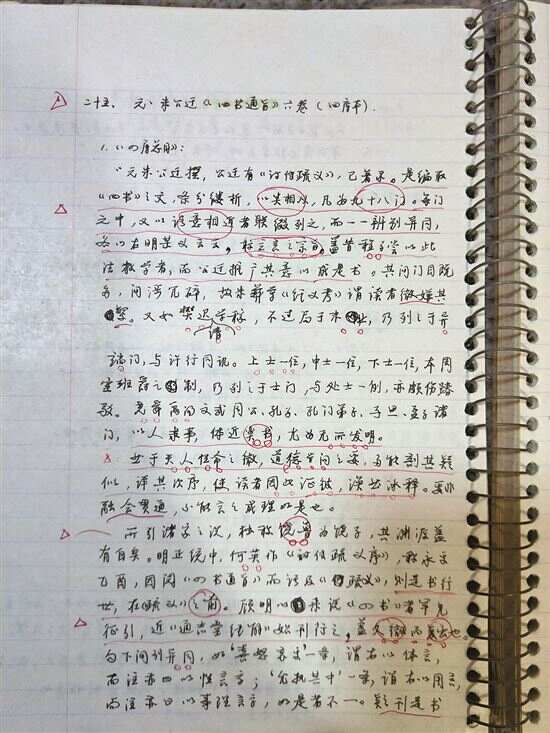 “在攻读阶段,有些需要通读,于我而言,所有与元代四书学相关的著述,应找尽找,然后把重要内容、例证逐一摘抄。包括相关零星信息的搜罗。另一重要方面,就是纵览与元史相关的正史(辽史、金史、元史等)以及与元代四书学相关的、与思想文化史相关的书籍。当时我的读书笔记和卡片有数十册,而当时书写、记录的工整字迹,现在看起来都有一种无形的力量。”