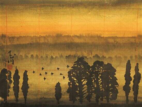此次展览的是潘育川的水墨风景作品,分为两个系列。第一个系列是潘育川的圆形风景,第二个系列是他在疫情期间的水墨小品日记探索。潘育川介绍:“这批作品均创作于疫情期间,一共画了70多幅,属于水墨画小品,第一个系列我称之为忧郁系列,第二个是夕阳系列。所有的画都是画在写书法的毛边纸上,纸的材质及黄旧的颜色加上有许多方格红线。两系列用色强烈、气氛深沉,记录着我的心情。”