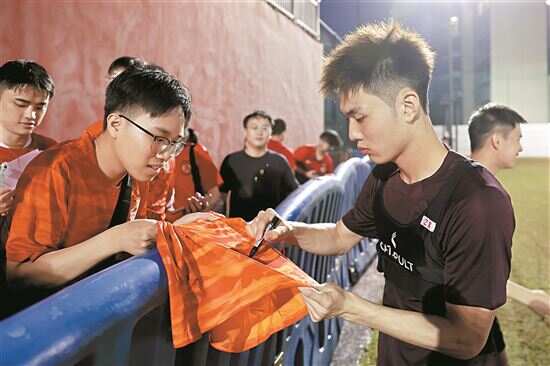 当队伍训练结束,球迷们涌入场地内与喜欢的球员合影。一个拥抱一次击掌,说的都是加油和鼓劲的话语。