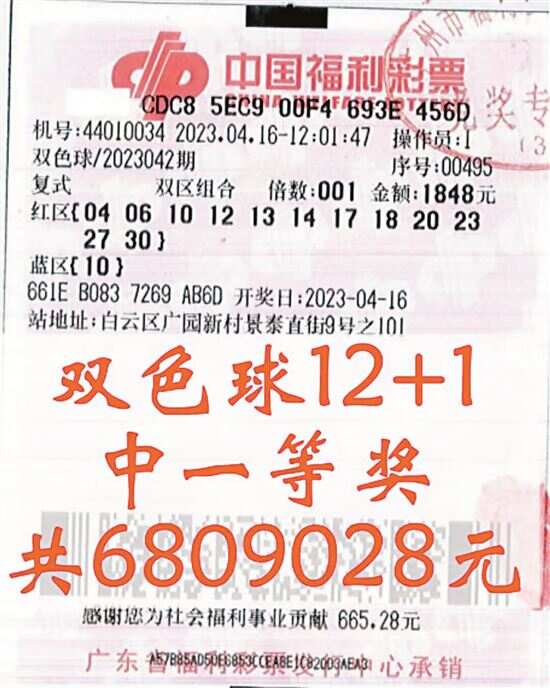 4月16日双色球第23042期开奖,当期全国共中出10注一等奖,单注奖金为665万多元。其中花落广州的1注一等奖由白云区44010034站中出,中奖彩票为一张1848元的“12+1”复式自选票。由于中奖彩民采用了复式投注,该张彩票除中得1注一等奖665万多元外,还额外中得多注固定奖,总奖金为680多万元。