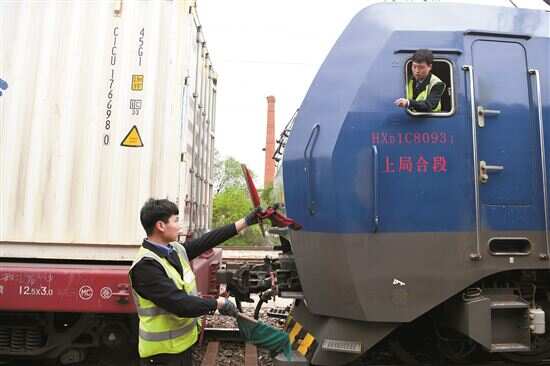 ■4月28日,副司机田锦波(左)在合肥东站指挥机车与中欧班列列车对接。