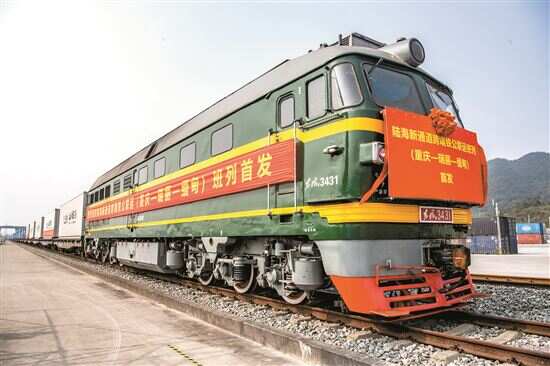 ■4月3日,陆海新通道跨境铁公联运班列(重庆—瑞丽—缅甸)首发班列在重庆江津小南垭铁路物流中心等候发车。