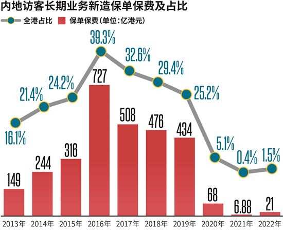 香港保险业监管局的数据显示,自2013年起,内地访客新造保单保费和占比持续走高,高峰为2016年的727亿港元,占全港新单保费的39.3%。此后,两项指标转向下滑,2017年-2022年,内地访客新造保单依次为508亿港元、476亿港元、434亿港元、68亿港元、6.88亿港元和21亿港元。受中国银联全面暂停以银联为支付渠道缴纳中国香港保险保费,投保香港保险必须本人亲自在香港签署合同以及新冠疫情等多重因素影响,2021年的内地访客新造保单接近“冰点”,去年才稍有回暖。