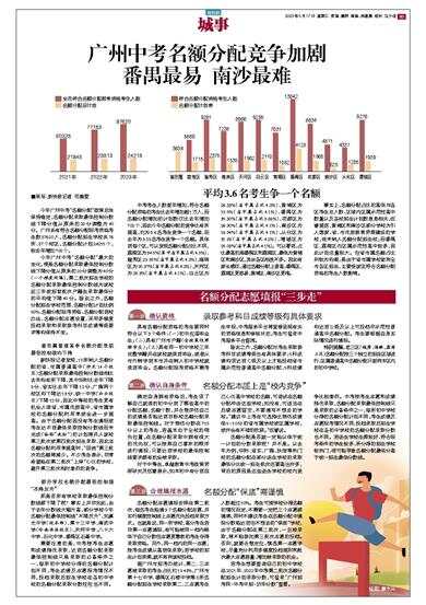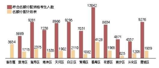 中考考生人数逐年增加,符合名额分配资格的考生比去年增加超1万人,而名额分配增加的计划数仅比去年增加702个,因此今年名额分配的竞争比有所提高,约为3.6名考生竞争一个名额,而去年为3.28名考生竞争一个名额。具体到每个区,可以发现名额分配占比不同,荔湾区为34.5%(其中省市属占比4.3%)、越秀区29.85%(省市属占比4.2%)、海珠区为25.37%(省市属占比4.2%)、天河区为25.3%(省市属占比4.1%)、白云区为26.83%(省市属占比4.2%)、黄埔区为19.5%(省市属占比4.1%)、番禺区为35.80%(省市属占比3.86%)、花都区为26.90%(省市属占比4.1%)、南沙区为16.94%(省市属占比4.1%)、从化区为31.93(省市属占比4.2%)、增城区为25.03%(省市属占比4.1%)。可以看到,占比最高的是番禺区和荔湾区,最低为黄埔区和南沙区,其余各区相差不多。因此有家长感叹,通过名额分配上普高,番禺区、荔湾区更容易,黄埔区、南沙区更难。