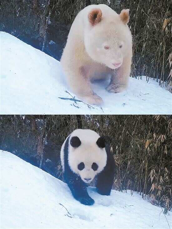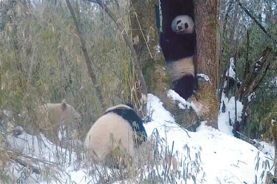 其中一处红外相机记录下白色大熊猫与一对大熊猫母子同框的画面,通过观察,中国大熊猫保护研究中心工作人员认为,画面中的熊猫妈妈极有可能是白色大熊猫的妈妈。