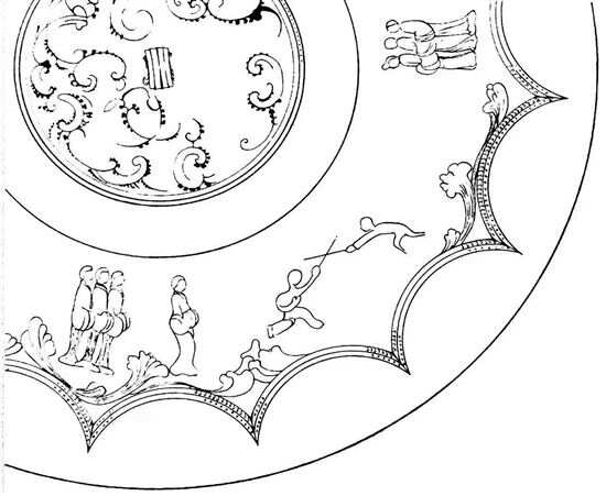 ■南越文王墓中共出土绘画铜镜四面,其中这一面是目前国内考古发现最大的西汉绘画铜镜。铜镜绘画分为内外两区,区内绘卷云纹图案,外区绘人物,使用的颜料有白和青绿等色。绘画内容是两人跨步弓腰击剑,两侧数人旁观的图案。绘画铜镜出现于战国晚期,所绘内容多为云纹、动物纹,出土很少。这面铜镜的绘画风格与湖南长沙马王堆一号墓出土的帛画有相似之处。南越王博物院供图