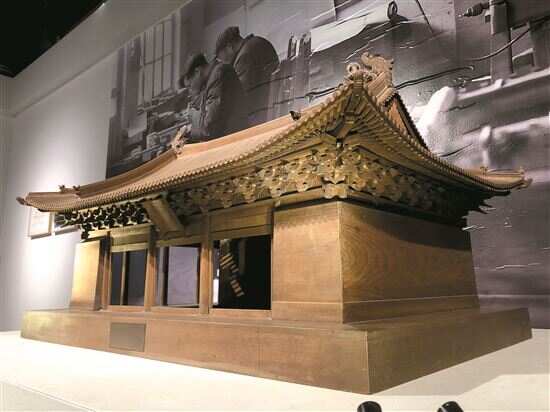 展览现场介绍,模型用料考究,整体造型优美,雕刻细致,各层比例精准,柱身卷杀、侧脚、生起均有体现,内外檐各类斗、梁柱、藻井等与实物无异,屋顶鸱尾、脊兽造型逼真,槅扇门窗均可自由开启,体现了高超的技艺水平。